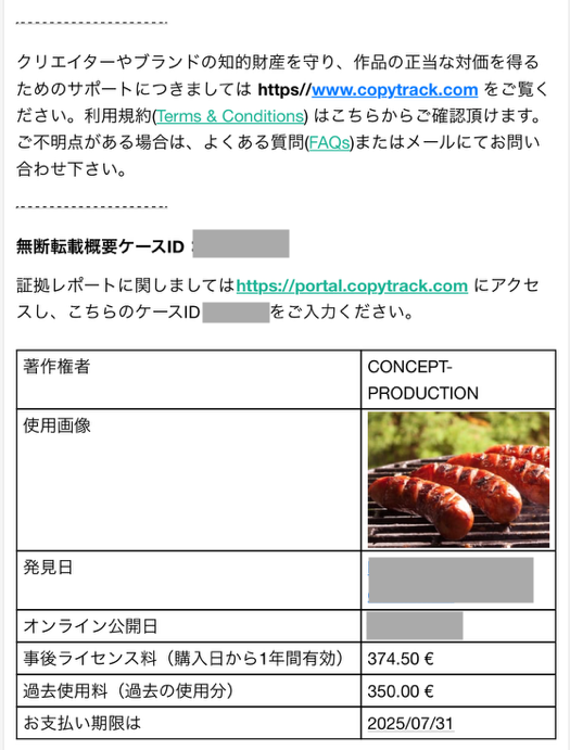 お手数をおかけ致しますが、協力弁護士にご連絡前の2025/07/10までに、ライセンスが証明できる書類のご提示をお願い致します。 ケース詳細につきましては、下記をご覧いただき、https://portal.copytrack.comにアクセスしケースID●●●●●をご入力ください。